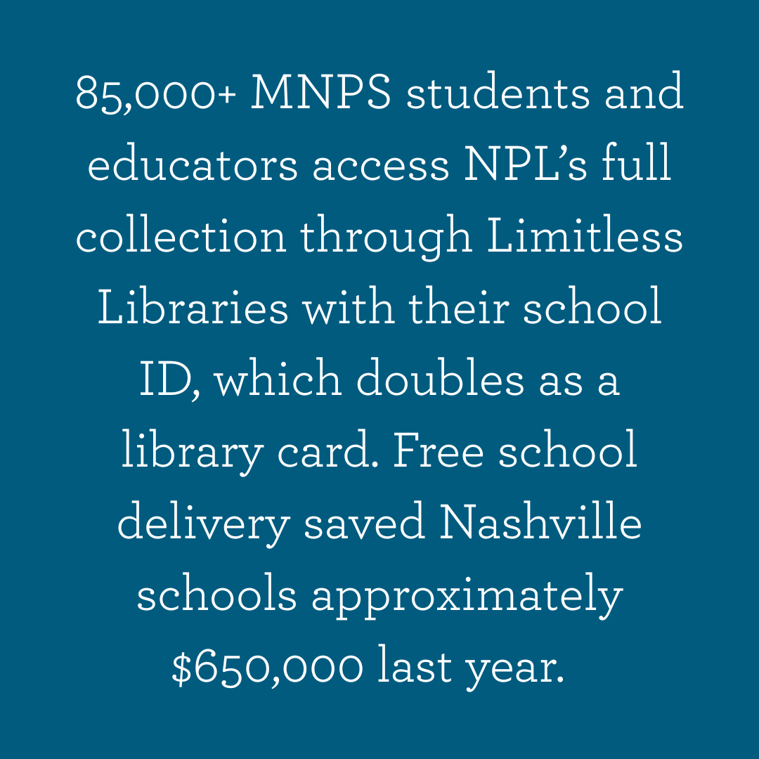 Over 85,000 Metro Nashville Public School students and teachers benefit from Limitless Libraries (LL). A shared catalog and school IDs that double as library cards provide students, their families, and educators access to the over 2 million items in NPL’s collection delivered to their schools within three days.