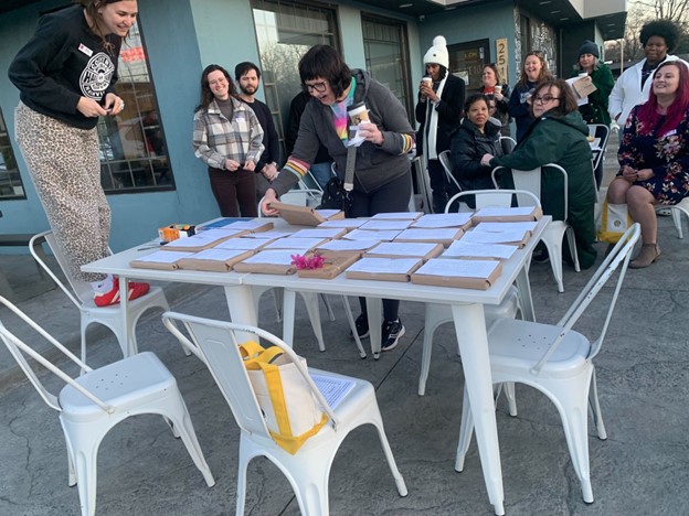 This month, I’m excited to highlight our incredible recent membership event! On March 18th, Next Chapter Society members gathered at Caliber Coffee for drinks, treats, and a blind book swap. Caliber ran a $5 drink and a pastry special deal for NCS members, and we also provided some light bites for attendees to snack on throughout the event.